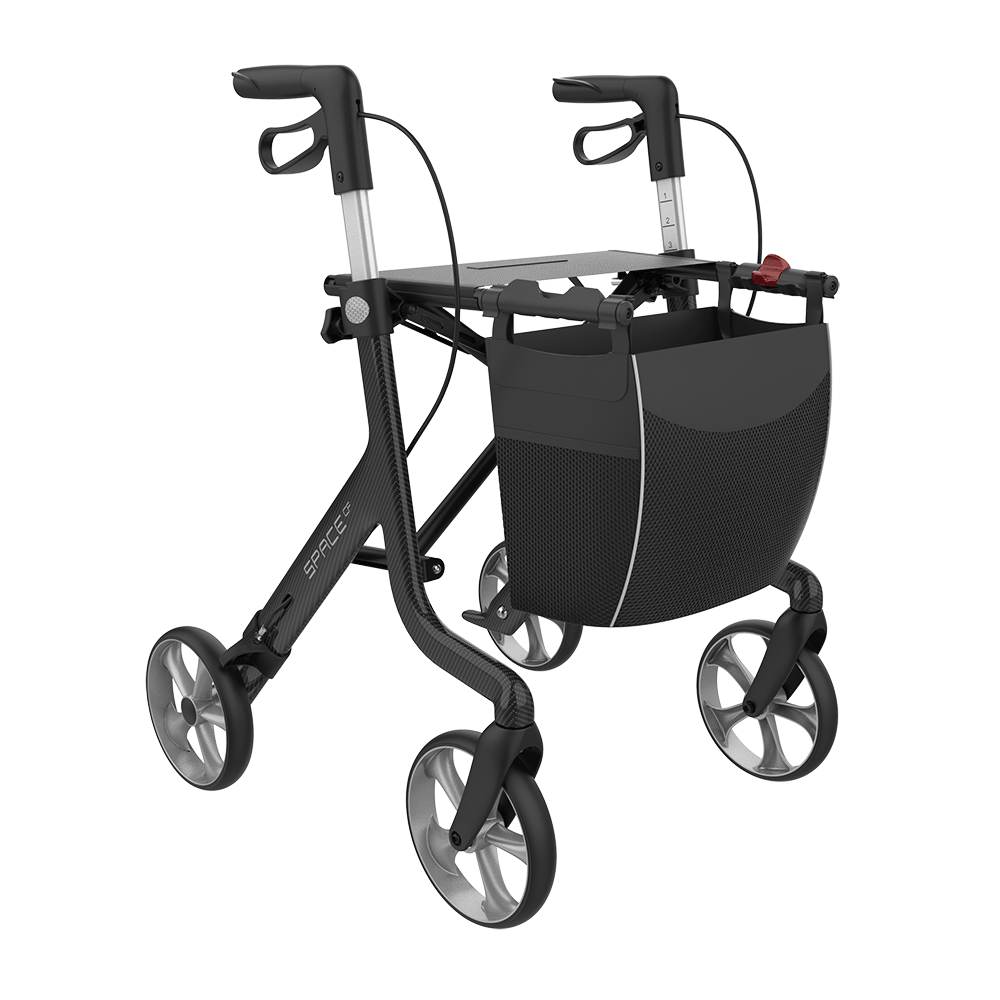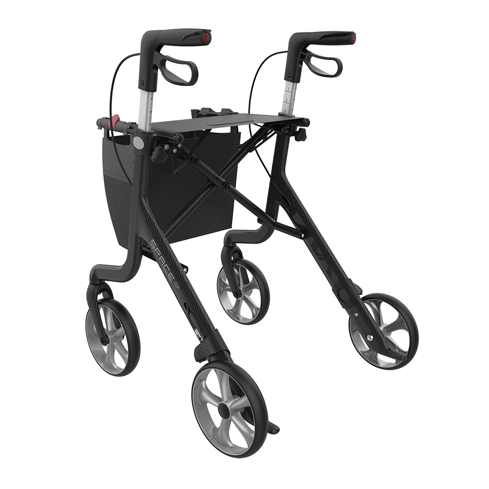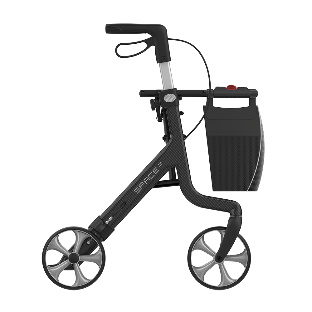 Il rollator SPACE CF combina un design intuitivo, linee pulite ed è in carbonio. Il telaio leggero lo rende molto agevole da spingere, sollevare e spostare, sia internamente che esternamente. Fascia schienale e portabastoni incluso.